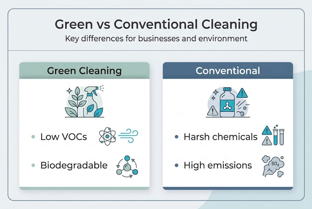 - Green cleaning may be slightly more expensive upfront but offers health, compliance, and cost benefits over time.