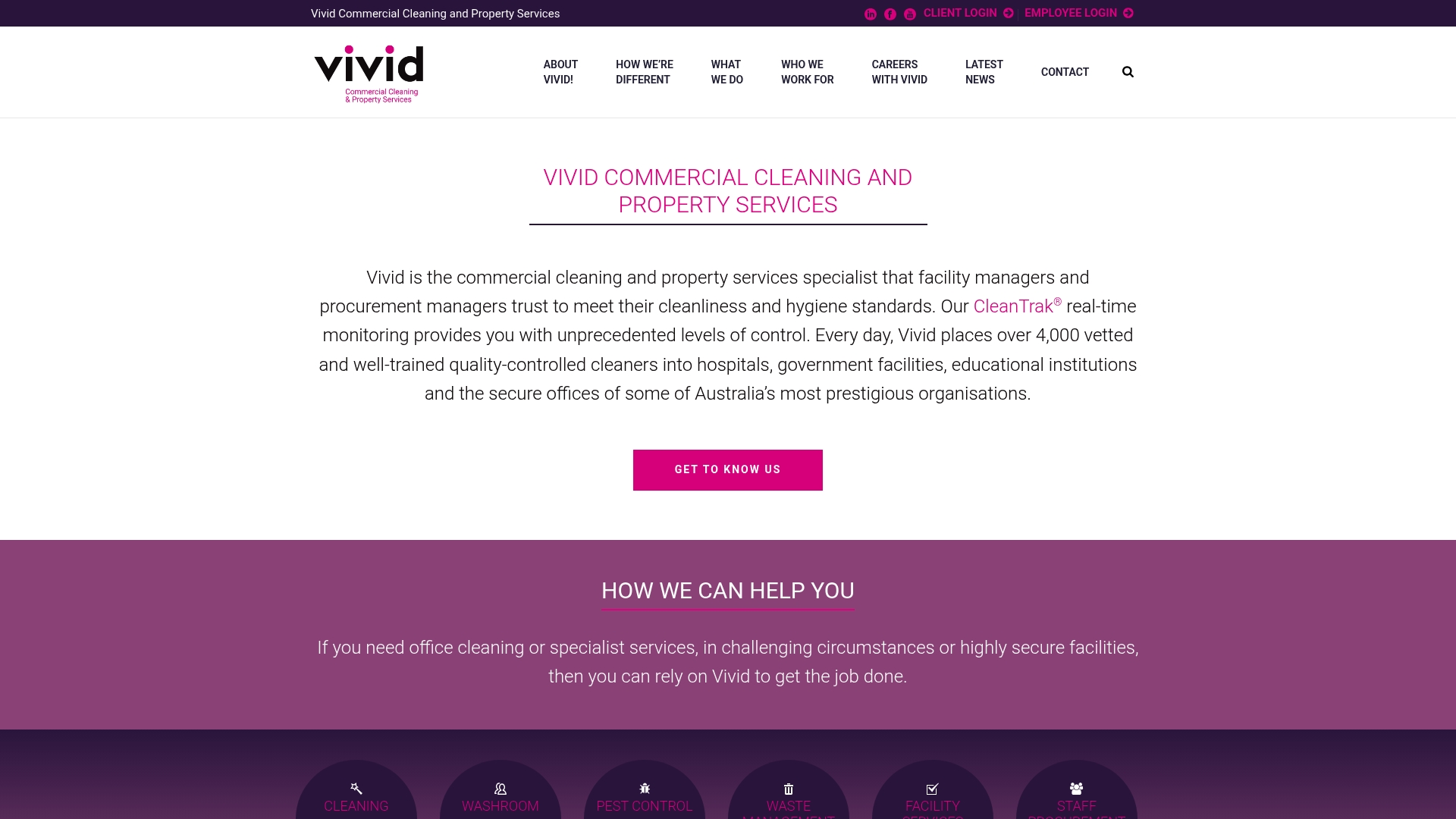 Vivid differentiates through CleanTrak® coupled with a broad service suite, giving clients a single supplier for complex cleaning and facilities needs. That single supplier approach simplifies contract management and performance reporting.