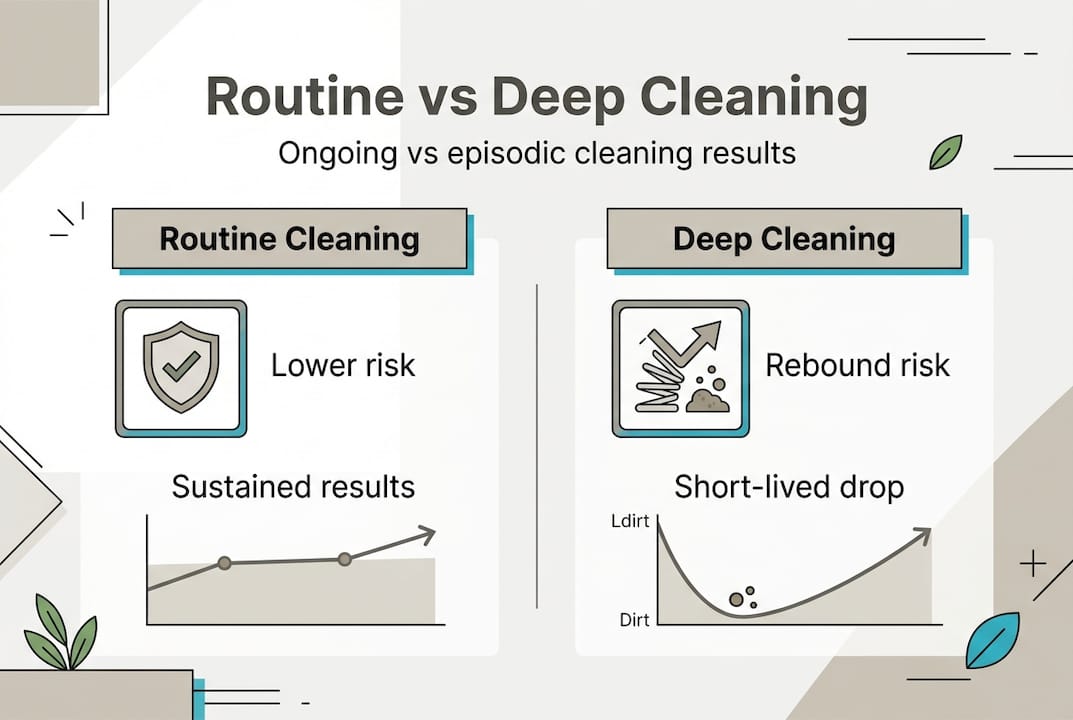 Routine cleaning maintains reduced microbial loads over time, whereas episodic deep cleaning often leads to rebound contamination. Enhanced routine cleaning reduces MRSA environmental detection by 41%, highlighting sustained reduction in pathogen presence that one-time interventions cannot achieve. Deep cleans can temporarily reduce contamination to very low levels, but without consistent follow-up, surfaces recolonise rapidly. Pathogens introduced by occupants, airborne particles, and environmental sources quickly restore contamination to pre-cleaning levels, often within 24 to 48 hours. This rebound effect undermines the investment in deep cleaning and leaves facilities vulnerable during the intervals between interventions.